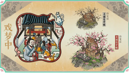 完成主线任务后饮下「桃花仙露」,解开灵猫西西设下的重重谜题,大人或可改写往日遗憾,收获圆满结局。还可领取全新建筑奖励「灵猫花中眠」。