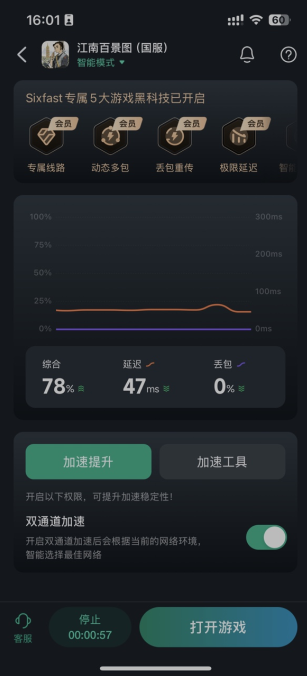 3、列如:在Sixfast回国加速器内找到【江南百景图】国服国际服都能正常加速,开启加速等待圆圈转到100%以后,再重启游戏就能极大程度降低延迟了!(其他游戏也是一样的操作)
