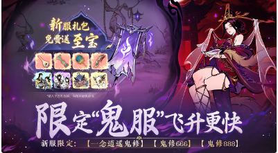 再踏仙途,入我鬼道,新大区【鬼道逆仙】7月5日开启!“鬼服”飞升更快,两天元婴,五天化神,一个月即可飞升灵界。新服限定礼包码“鬼修666”“鬼修888”“一念逍遥鬼修”,免费抽取造化至宝、灵兽等好礼!