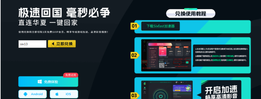 2、下载好后按照提示登录注册,在会员中找到【兑换码】,使用【six13】先领取时长,才能使用软件,也可以直接点击:https://www.sixfast.com/tg-exchange 按照下图所示填写兑换码【six13】,并按照右边步骤注册登录Sixfast,领取时长。(支持手机和电脑)
