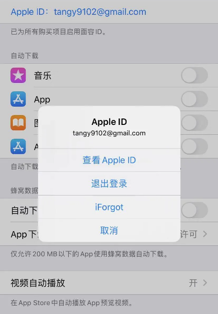 在app store账号页面,点击最上面的 Apple ID: xxxx,在出现的弹框中点击“退出登录”: