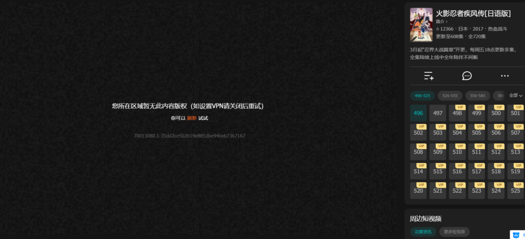 出国之后想看国内动漫火影忍者疾风传国外怎么看?您所在区域暂无此内容解决办法,却发现海外wetv找不到动漫,国内打开有提示“您所在区域暂无此内容(如设置VPN请关闭后重试)”,应该怎么才能看到电视剧呢?