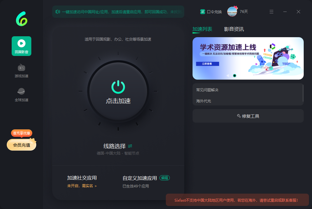 推荐使用Sixfast回国加速器来解决这些问题。能一键腾讯视频限制的问题