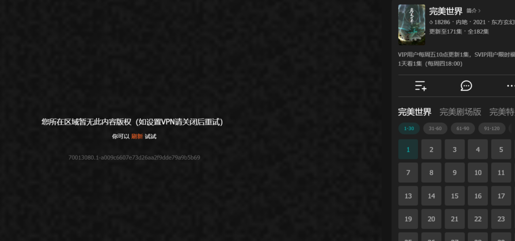 出国之后想看国内電視劇完美世界有怎么办?您所在区域暂无此内容解决办法国外怎么看?应该怎么才能看到电视剧呢?非常抱歉,根據版權方要求,您所在的地區無法觀看本片怎麼解決?