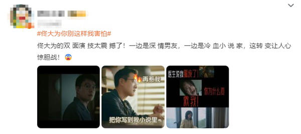 该剧开播后,多个话题引起网友热议,比如#佟大为你别这样我害怕#,有网友表示:“佟大为的双面演技太震撼了!一边是深情男友,一边是冷血小说家,这转变让人心惊胆战。”“佟大为的眼神戏真是太精彩了,一秒变脸。”