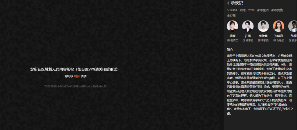 出国之后想看国内電視劇承欢记有怎么办?您所在区域暂无此内容解决办法国外怎么看?应该怎么才能看到电视剧呢?非常抱歉,根據版權方要求,您所在的地區無法觀看本片怎麼解決?