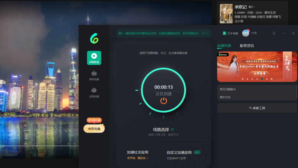 推荐使用Sixfast回国加速器来解决这些问题。能一键腾讯视频问题