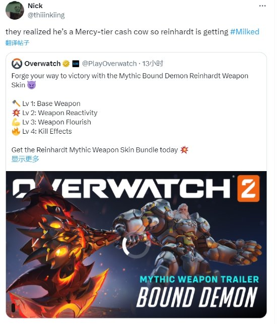 “(他们)暴雪意识到莱因哈特是和天使同等水平的摇钱树并且开始压榨他了。”一位玩家评价道。“80个神话棱晶买武器皮肤就是骗钱”““皮肤很酷,但我不会为了他花80美元的”玩家社区中不乏此类消极的反应,