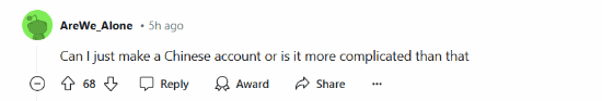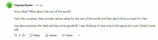 搞啥呢?世界的其他地方呢?暴雪主动降低了世界其他地方的价值,而却白白给予中国这么多东西,暴雪应该给所有玩家送点人情。我本来在考虑回归游戏,但现在我开始怀疑我到底还会不会回来玩。