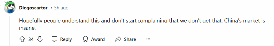 希望大家能理解这一点,别抱怨我们没得到这些东西,中国市场真的是非常疯狂。