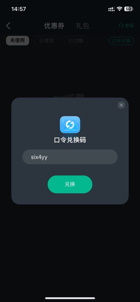 2、下载好后按照提示登录注册,在会员中找到【兑换码】,使用【six4yy】先领取时长,才能使用软件,也可以直接点击:https://www.sixfast.com/tg-exchange 按照下图所示填写兑换码【six4yy】,并按照右边步骤注册登录Sixfast,领取时长。