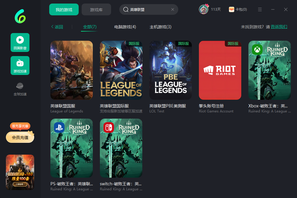 5.游戏库搜索英雄联盟然后点击加速即可 除了国服其他海外国际服也可以正常加速