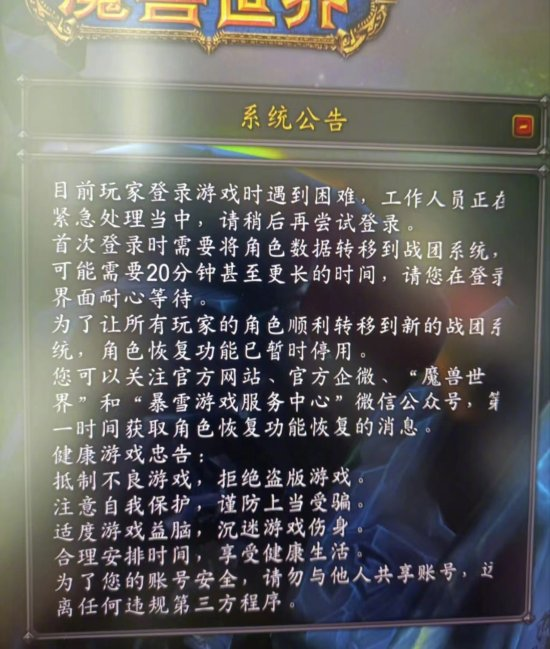 根据官方的系统公告显示,“工作人员正在紧急处理当中”。此外,首次登录时需要将角色数据转移到战团系统,可能需要20分钟甚至更长的事件,请玩家在登录界面耐心等待。