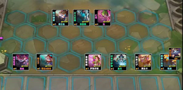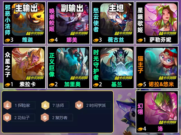 先上阵容组成,这是一套以7法师为主的多羁绊赌卡阵容。9人口之后索拉卡的位置换泽拉斯,法杖越多伤害越高。