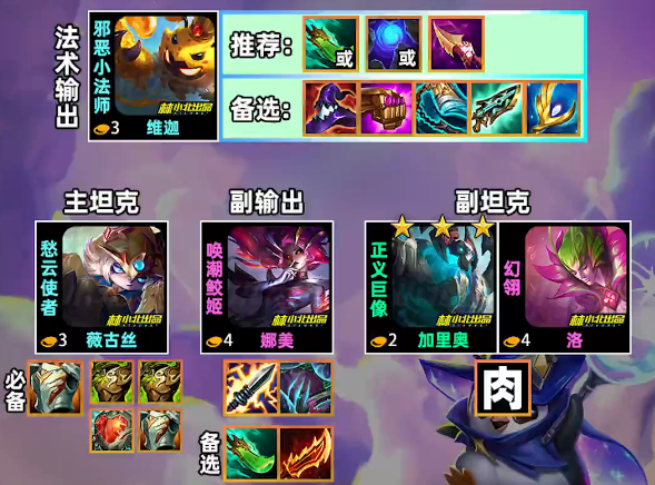 装备选择上,小法师蓝和青龙刀必备。薇古丝板甲必备,其余就堆狂徒和坚定之心。娜美电刀减魔抗。另外的副坦堆剩余的肉装
