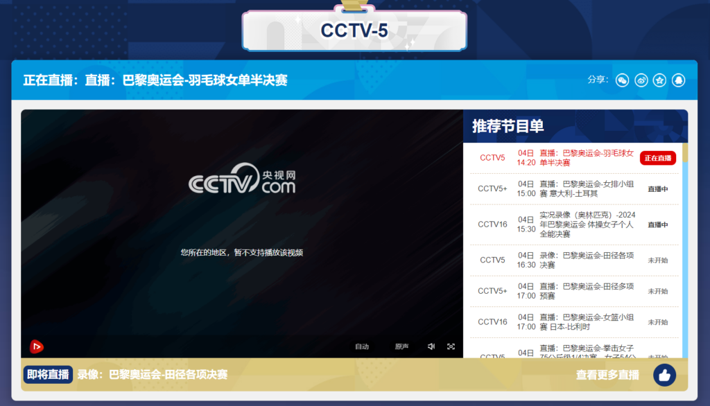 由于各个地区和国家的服务商不同,各地的区域调整不同,国内正常转播奥运赛事的中文流直播在部分地区没有办法正常观看。在海外地区使用上述平台网站收看直播的时候会出现如下图中显示“您所在的地区 暂不支持的”的问题