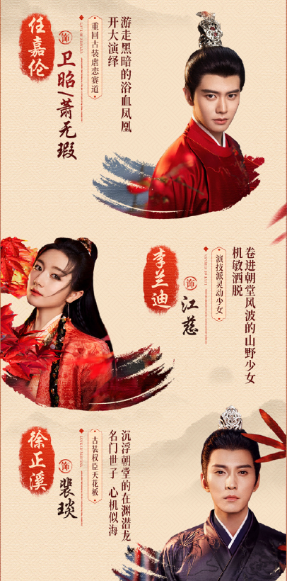 裴琰,一位机智的谋士,趁机将受伤的江慈救入府中,希望借此找到幕后的”破坏者”。随着剧情的发展,萧无瑕、江慈和裴琰三人各怀鬼胎,他们之间的爱恨情仇在大梁和月落两个国家之间交织展开,形成了一幅动人心弦的家国画卷。