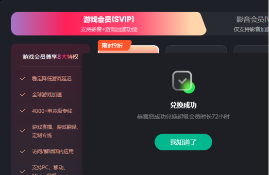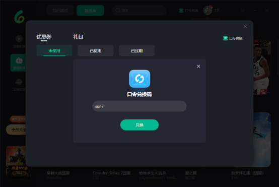 PC用户只需点击https://www.sixfast.com/进行下载,安装完成注册登录之后,点击首页的口令兑换,输入兑换码【six17】,即可免费获得72小时SVIP时长,畅玩国服游戏,纵享国内影音;也可以直接进入https://www.sixfast.com/tg-exchange,输入兑换码,领取时长。