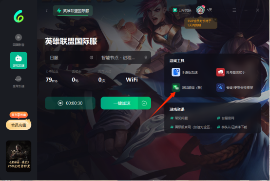 下载好后,找到英雄联盟国际服,加速后,点击右侧游戏翻译,再启动游戏就可以汉化成功了!