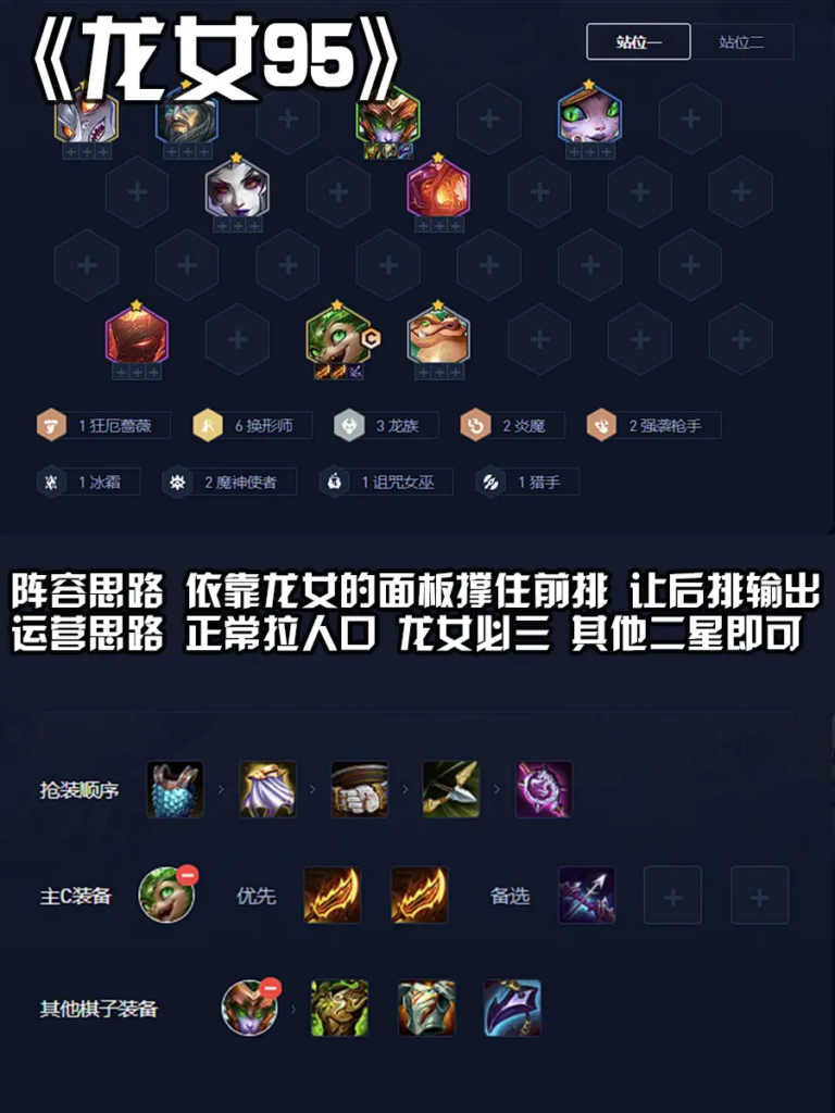 “龙女95”阵容是一套以龙女为核心的前排坦克+后排输出的阵容。通过合理的羁绊选择和装备分配以及灵活的运营思路可以在S12赛季中取得不错的上分效果。