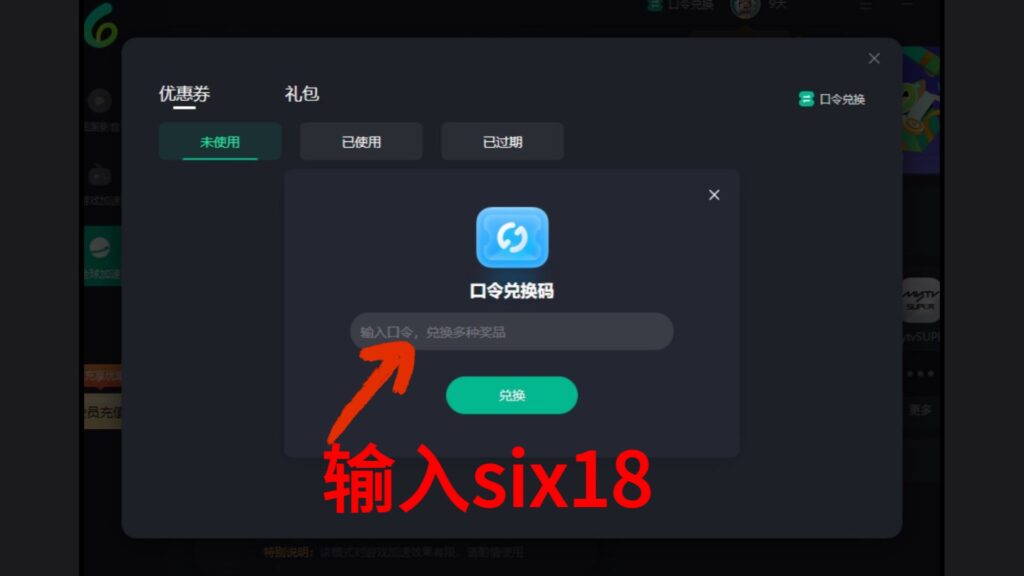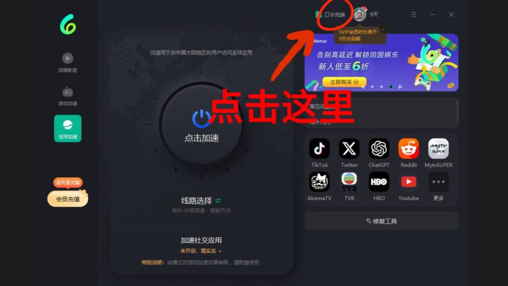 2、下载好后按照提示登录注册,在会员中找到【兑换码】,使用【six18】先领取时长,才能使用软件,也可以直接点击:https://www.sixfast.com/tg-exchange 按照下图所示填写兑换码【six18】,并按照右边步骤注册登录Sixfast,领取时长。(支持手机和电脑)