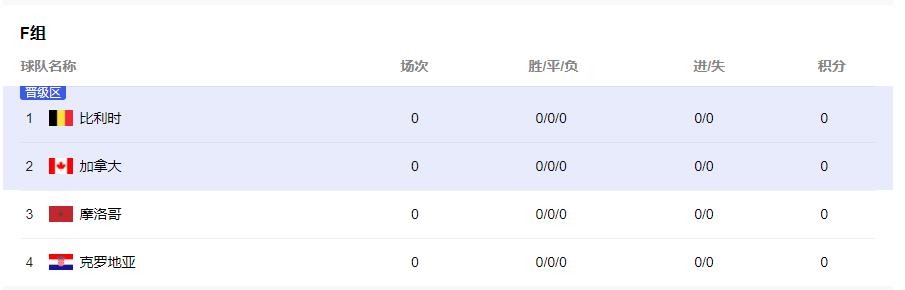 F组:比利时(F1)、加拿大(F2)、摩洛哥(F3)、克罗地亚(F4)