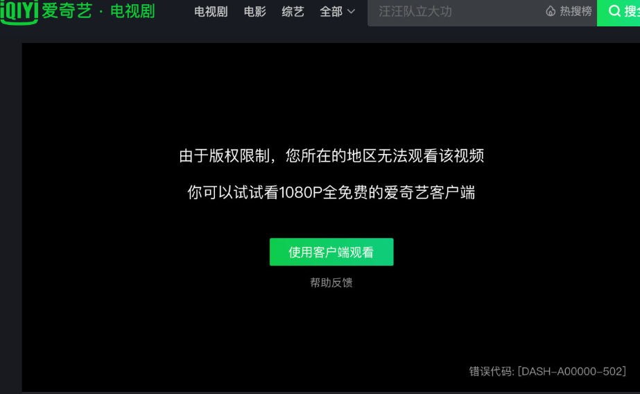 其实大家可以不用担心,走出国门也可以正常使用国内的主流观影软件,例如,腾讯、爱奇艺、咪咕等。但是大家会发现总会出现版权地区受限制的问题,会出现下图所示的问题: