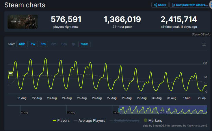 此前国内知名券商泰证券就曾预测《黑神话:悟空》有望在游戏发售首月就突破2000万份销量。虽然游戏科学官方目前并未进一步披露游戏目前为止的销量,但考虑到《黑神话:悟空》发售尚不足半个月的时间(SteamDB统计显示目前在线人数依旧超过57万),VG Insights的统计数据中也并未包含PS5及WeGame等平台,首月突破2000万销量对于《黑神话:悟空》来说可能近在咫尺。
