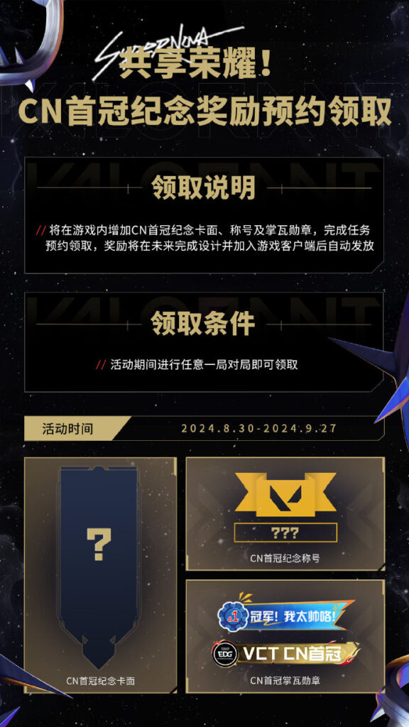 只需在活动期间(2024.8.30-2024.9.27)参与任意一局对局,您即可独家锁定CN瓦夺冠的珍贵纪念。更令人振奋的是,我们正精心筹备CN首冠专属纪念卡面与荣耀称号,一旦设计完成并上线游戏,将自动为您加冕,让这份荣耀伴随您的每一次战斗,共同铭记这历史性的胜利瞬间!
