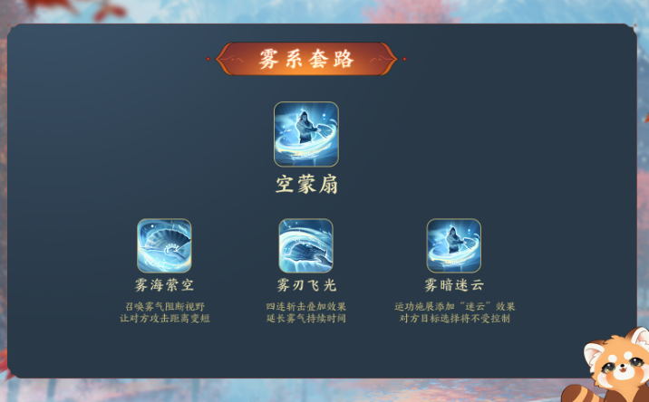 2.雾系套路“空蒙扇”以限制和控场招式为主,会用多种方式阻断对方的攻势,干扰招式释放的效果。
