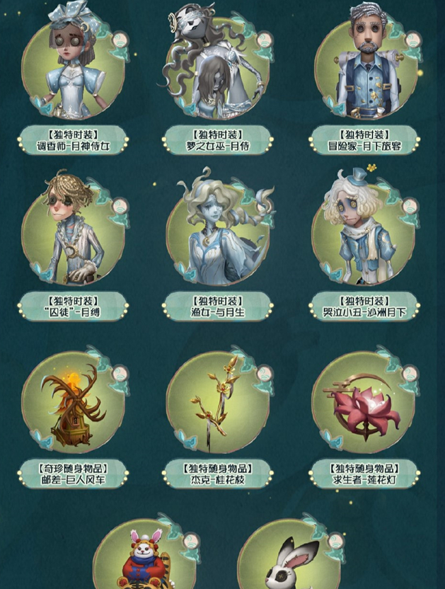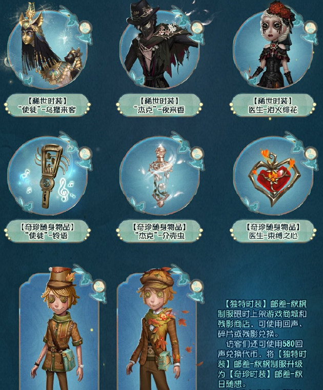 除了六款中秋主题独特时装外,【稀世时装】“使徒”-乌撒来客与【奇珍随身物品】“使徒”-铃语、【稀世时装】“杰克”-夜来香与【奇珍随身物品】“杰克”-介壳虫、【稀世时装】医生-浴火绯花与【奇珍随身物品】医生-束缚之心也将在本次活动中限时返场。值得一提的是,【独特时装】邮差-秋枫制服也将限时上架游戏商城和残影商店,访客们可使用回声、碎片或残影兑换,还可使用580回声兑换代币,将【独特时装】邮差-秋枫制服升级为【奇珍服装】邮差-秋日随想,在升级完成后,【独特时装】邮差-秋枫制服仍将保留。