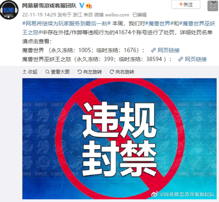 在网易暴雪宣布分手的之后,有网友称网易网易暴雪游戏客服团队官方发布违规帐号封禁公告,团队对《魔兽世界》《魔兽世界巫妖王之怒》中存在外挂/作弊违规行为账号封禁41674个,其中《魔兽世界》永久冻结1005个、临时冻结1676个;《魔兽世界巫妖王之怒》永久冻结399个;临时冻结38594个。