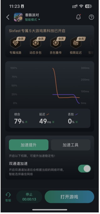 3、列如:在Sixfast回国加速器内找到【香肠派对】国服国际服都能正常加速,开启加速等待圆圈转到100%以后,再重启游戏就能极大程度降低延迟了!(其他游戏也是一样的操作)