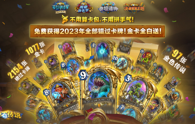 值得关注的是,送2023全年2154张卡牌,包括1077张金卡、97张金色传说卡牌,这仅仅只是炉石国服回归福利的第一环。