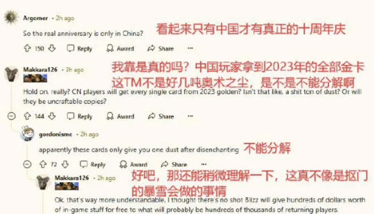 这一消息也让外服的炉石玩家表示非常的震惊,他们均认为国服回归送给中国玩家的福利才是真正的十周庆典,而国际服送的几个便宜卡包明显是后妈给的。