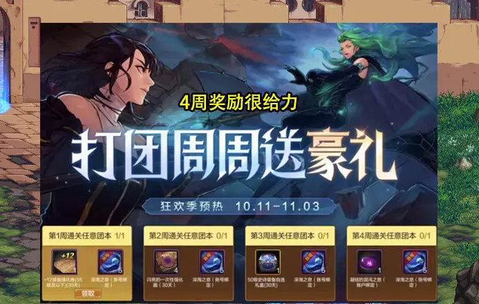 第一周的奖励是+12装备强化券+5个深海之息。第2周的奖励则是4个一次性强化器(30天),5个深海之息。第3周奖励是50级史诗装备自选礼盒(30天),5个深海之息。第4周奖励则是1个凝结的混沌之息,以及5个深海之息,奖励获取非常简单,只要在每周通关1次团本即可。