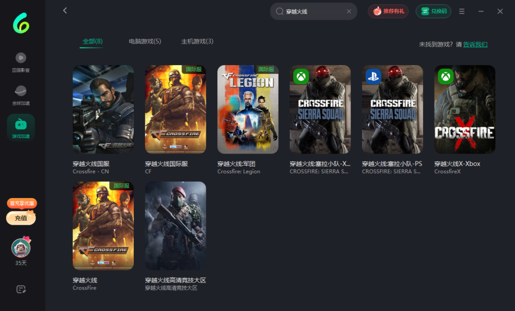 之后在游戏库内搜索穿越火线,然后点击加速,就可以正常解决在海外玩国服的网络问题
