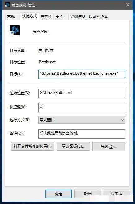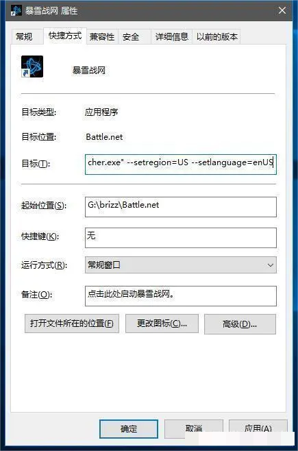 右键点击桌面战网客户端属性,在目标一栏的最后面复制 (–setregion=US –setlanguage=enUS),一定要记得把括号删除,文本中是有空格的哦。