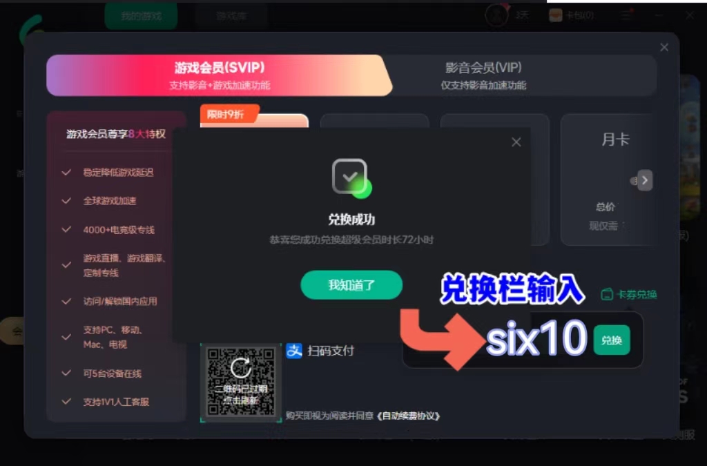 下载好后按照提示登录注册,在会员中找到【兑换码】,使用【six10】先领取时长,才能使用软件,也可以直接点击:https://www.sixfast.com/tg-exchange 按照下图所示填写兑换码【six10】,并按照右边步骤注册登录Sixfast,领取时长。