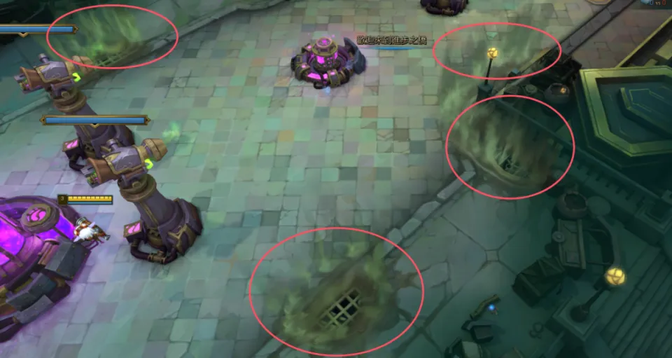 草丛均被雾气取代,祖安出门方式为钻下水道,皮城出门方式为坐海克斯传送门。祖安阵营可坐海克斯传送门,皮城阵营也可以钻下水道,不存在之前有人说不能坐敌方阵营传送门的情况。皮城高地则多了两块防洪坝(城墙),一塔左前方多了一块防洪坝(城墙)