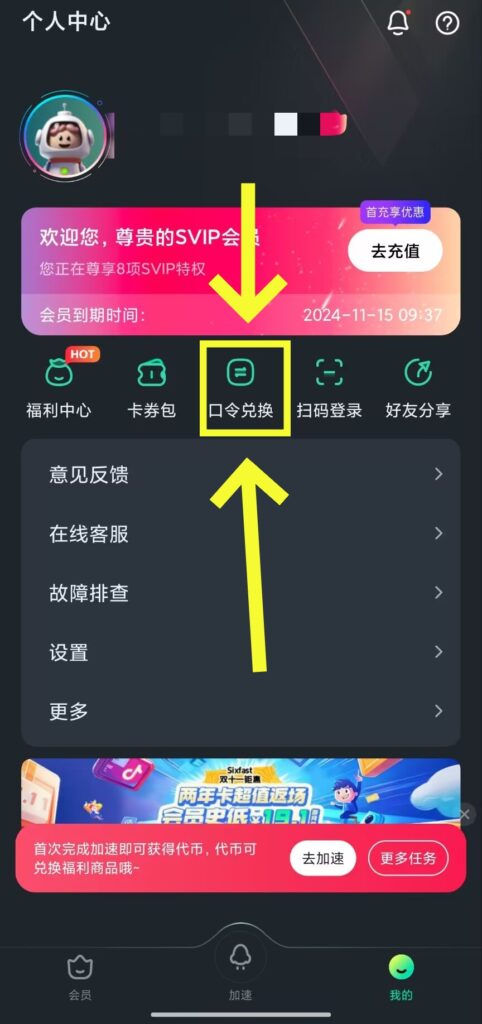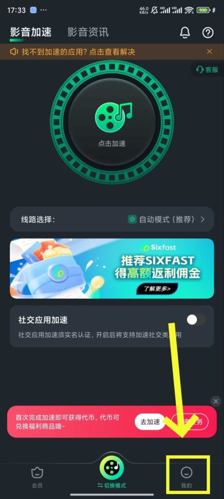 Sixfast应用下载注册后右上角找到兑换码,输入six3就能获得72小时使用时间,记得先兑换才能正常使用
