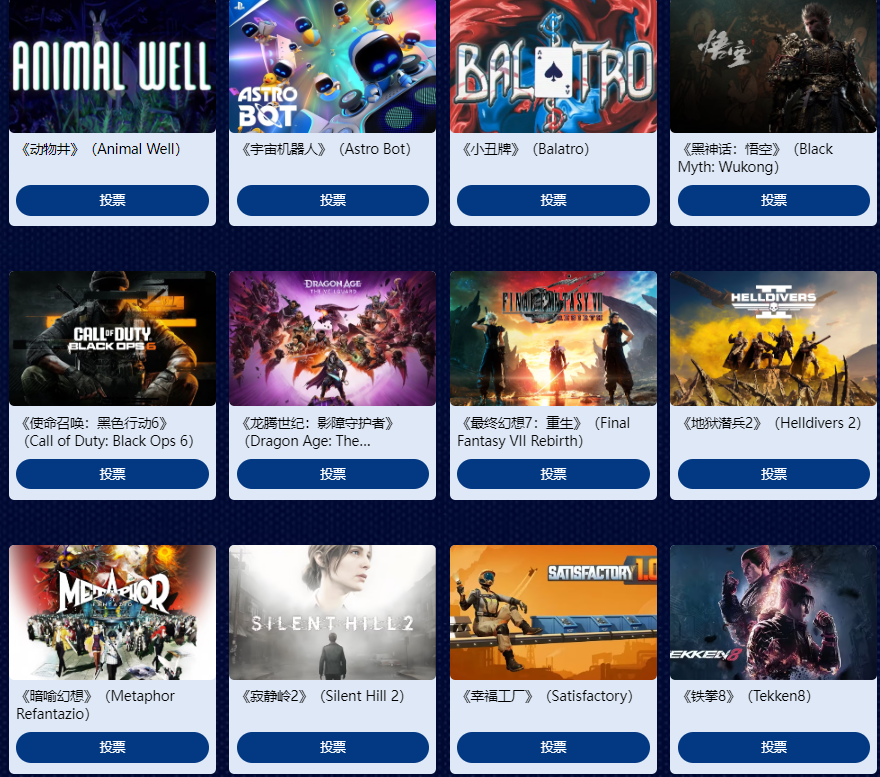 《动物井》《宇宙机器人》《小丑牌》《黑神话悟空》《黑色行动6》《龙腾世纪4》《最终幻想7重生》《地狱潜者2》《暗喻幻想》《寂静岭2重制版》《铁拳8》《幸福工厂》