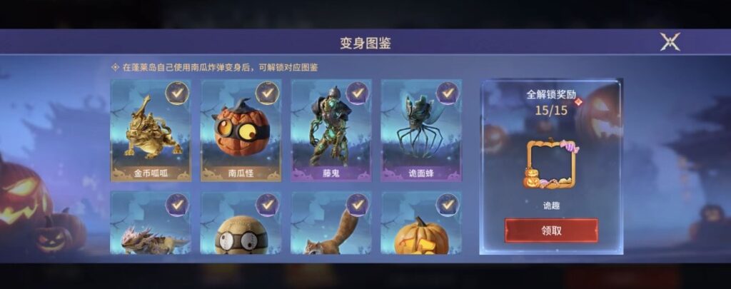 变身图鉴:在蓬莱岛自己使用【南瓜炸弹】变身后,可解锁对应图鉴;变身首次解锁图鉴时,将获得图鉴解锁【南瓜捣蛋礼】、【南瓜宝藏礼】、【南瓜福袋】、【南瓜小礼】等丰富奖励;解锁全部图鉴后,可获得万圣节专属纪念头像框【诡趣】。