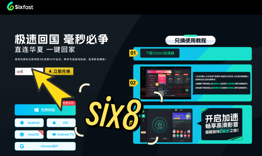 下载好后按照提示登录注册,在会员中找到【兑换码】,使用【six8】先领取时长,才能使用软件,也可以直接点击:https://www.sixfast.com/tg-exchange 按照下图所示填写兑换码【six8】,并按照步骤注册登录Sixfast,领取时长。(支持手机和电脑)