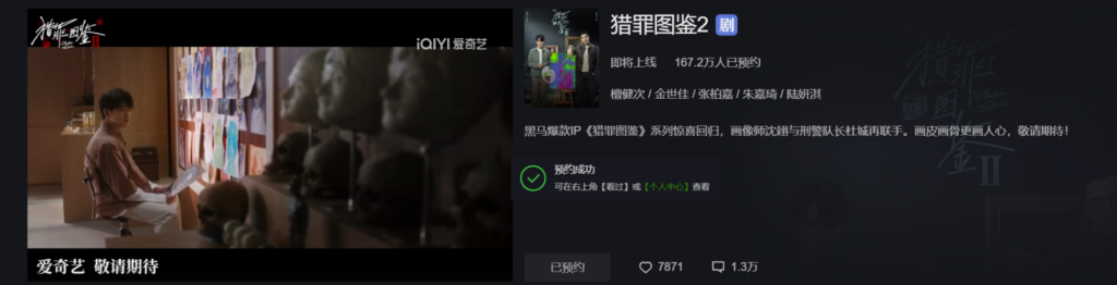 《猎罪图鉴》是由柠萌影业、柠萌开新及爱奇艺联合出品,张晓波监制、贾东岩总编剧、邢键钧执导、张翼芸担任制片人、檀健次、金世佳等主演的单元探案电视剧,该剧于2022年3月6日在爱奇艺和腾讯视频开播。