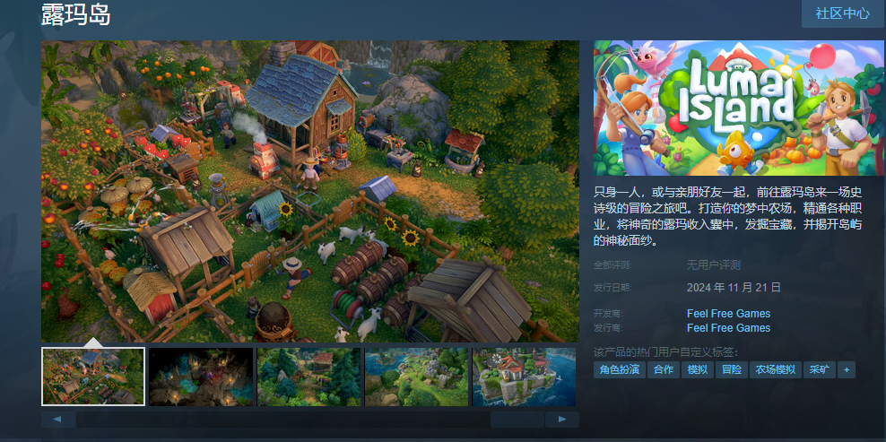 《露玛岛》是一款由 Feel Free Games 打造的多人合作农场模拟冒险游戏。以下是该游戏的一些主要资讯: