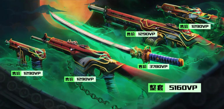 套装售价:全套5160点券,单枪1290点券,单刀3780电竞套装包含:狂徒,狂怒,战神,獠犬,鬼丸国纲