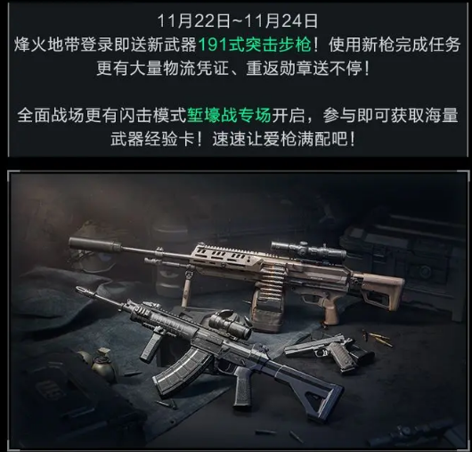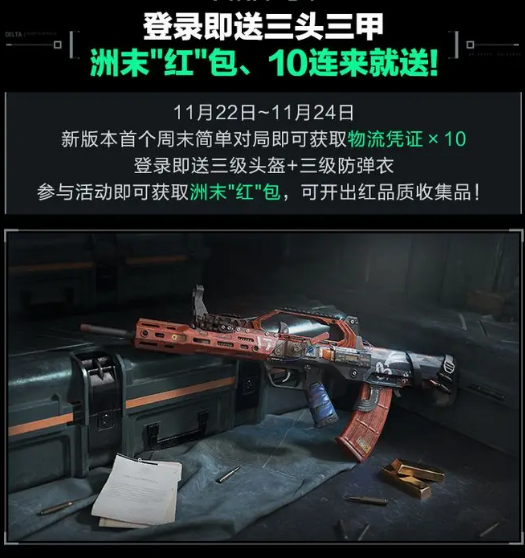 周末活动中,除了以往的单排开启,还登录送头甲,经验卡和新武器直接开放使用