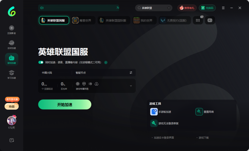 3、在Sixfast回国加速器内找到英雄联盟国服,加速到100%就能解决上述问题了
