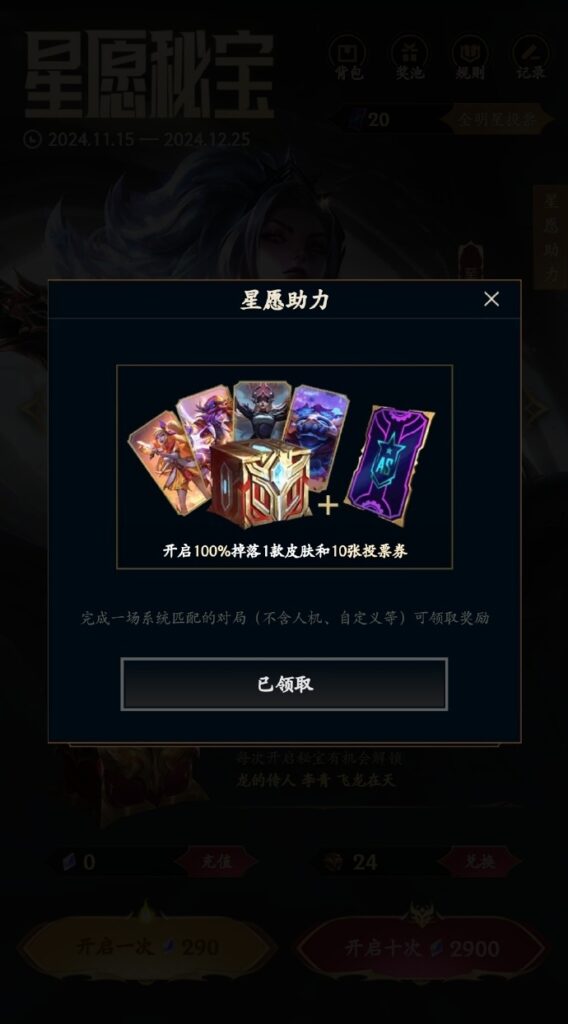 星愿秘宝活动通常在特定的时间段内开放,比如2024年的活动时间是11月15日至12月25日。在这个时间段内,玩家们可以通过参与活动,获得开启秘宝的机会。只需要完成一局对局,即可获得一次开启机会